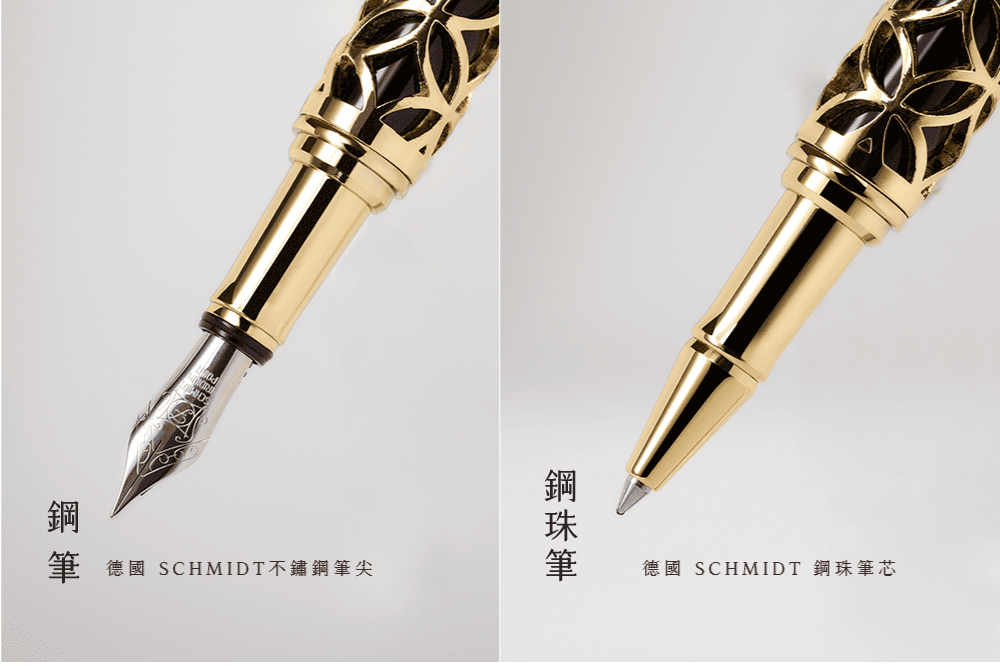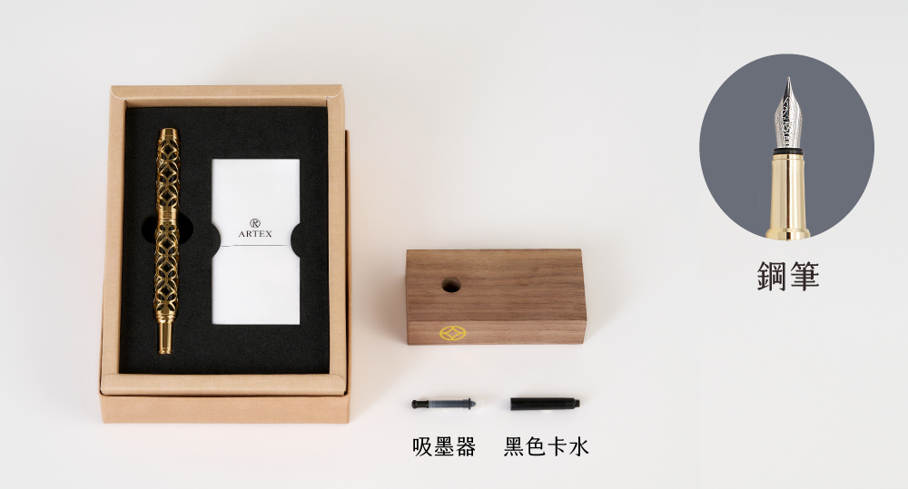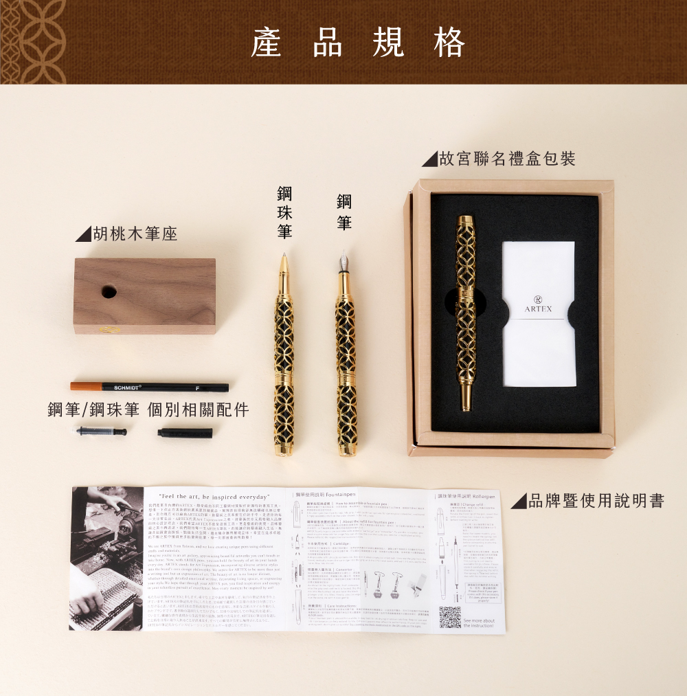 不論是鋼筆或是鋼珠筆,均包含:胡桃木筆座、品牌暨使用說明書、故宮聯名禮盒包裝