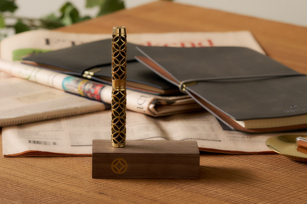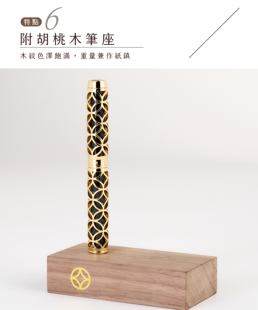 隨禮盒附贈的胡桃木筆座,穩重的實心重量可兼作紙鎮使用,低調典雅的胡桃木紋色澤飽滿、質地細膩、軟硬適中,正面鑲上錢紋燙金,不僅可作為典雅的文具擺飾,更是案頭洗練的設計搭配。溫潤木質與金屬光澤和諧統一,展現出極致的工藝美感,更體現尊貴與獨特。